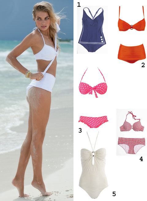 1. Gideon Oberson, 7279 руб., салоны Эстель Адони 2. Gideon Oberson, 6890 руб., салоны Эстель Адони 3. Oasis, 1960 руб. 4. Matthew Williamson for H&M, 1899 руб. Главное фото: Victoria’s secret. Ретро Одно из модных направлений, перешедшее в это лето из прошлого – купальники в стиле «ретро». Высокие закрытые трусики и лифы с широкими бретельками, «классические» для ретро рисунки (горошек, однотонная полоска), размытые, «полинялые» цвета в духе 70-х или яркие, броские расцветки «под 80-е» - такие купальники выглядят очень мило и оригинально.