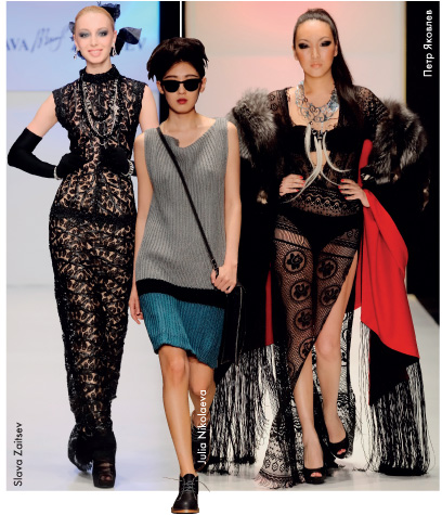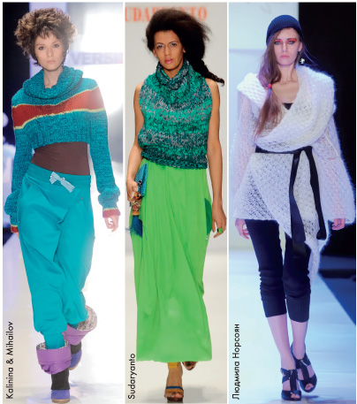 Вязаный бум19.09.2011 07:07![]() Весной 2011 года в Москве прошли недели показов дизайнерских коллекций для сезона осень–зима 2011/2012 года: с 31 марта по 5 апреля в Центральном международном конгресс-центре Российская неделя моды (Mercedes-Benz Fashion Week Russia), с 29 марта по 4 апреля в Гостином дворе Неделя моды в Москве (Volvo Fashion Week). Основные тенденции продемонстрировали модельеры из России, Беларуси, Украины, Великобритании, Малайзии, Италии, Испании, Германии, Перу. Что же будет модным в трикотаже в сезоне осень–зима 2011/2012 года? Лидирующие стили: романтический, осовремененный классический, спортивный (в том числе спорт-шик), колониальный, кэжуал, милитари. Были и вещи haute couture. Явно прочитывались обращения к стилистике 1950-х годов (подражание Диору), к кинематографическим образам того же периода, были и коллекции в духе начала 1960-х. Кто-то создавал образ женщины-вамп, или роковой женщины. Некоторые черпали вдохновение в постмодернизме, советском авангарде, дальневосточной стилистике (японской, китайской). Детская тема во взрослой моде реализовывалась через кукольный образ и стилизованные школьные передники, трогательно-детские принты. ![]() Мужской ассортимент В коллекциях для мужчин прослеживались классические бушлаты из шерсти, тренчи с водоотталкивающим покрытием, брюки из плотного джерси (трикотажное шерстяное полотно) и мягкого футера (средней плотности полотно, гладкое с лицевой стороны и начесное с изнаночной), сорочки из принтованного хлопкового трикотажа. Среди игровых моделей – балаклавы (вязанная шапка-шарф с прорезью для лица или глаз, закрывает голову и шею), куртки с застежкой как у женских боди, футболки с принтами в стиле граффити (с надписями). Женский ассортимент Главными силуэтами стали: облегающий; строгий прямой, «рубашечный»; романтичный (удлиненный, расклешенный); «военный» силуэт (четкие линии плеч, строгость в деталях). Объемы обыгрывались за счет драпировок, массивных или веерообразных. Свободный крой компенсировался четкой фиксацией на плечах, талии. – Верхняя одежда: длинные кардиганы (пальто из плотного трикотажа), классические элегантные или объемные, прямые без воротника или напоминающие лапсердак, пальто различных силуэтов, которые легко трансформируются с помощью поясов, шелковых лент и молний, огромные трикотажные пальто или полупальто мягких силуэтов со спущенной или скользящей линией плеча. Активно использовалась асимметрия. – Платья: длина варьировалась от ультракоротких до макси. Модели: сарафаны, туники (минималистичные, свободные, объемные, летящие), сафари, облегающие трикотажные, платья со складками, с драпированной или плиссировкой юбкой, с открытой спиной, платья-конверты, платья-шаровары из плиссе, платья-халаты, модели свободного кроя, супероблегающие лифы с пышными юбками, платья, напоминающие мужскую рубашку, струящиеся или летящие, платья-футляры из плотного материала. Коктейльные и вечерние платья с принтами в виде цветов и бабочек. – Юбки длинные (до пола), летящие, струящиеся юбки-колокола, гаде, юбки с ломаными линиями, с несимметричной плиссировкой, длинные в спортивном стиле, юбки в духе балетных пачек с облегающим верхом, строгие юбки-карандаши. – Брюки: прямые и узкие, широкие и свободные, брюки-клеш и шаровары, укороченные и шорты, в том числе в спортивном стиле. – Кроме того болеро, джемперы 